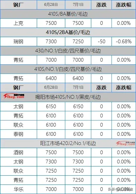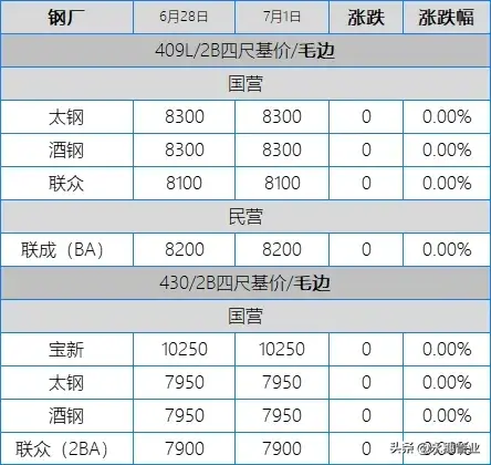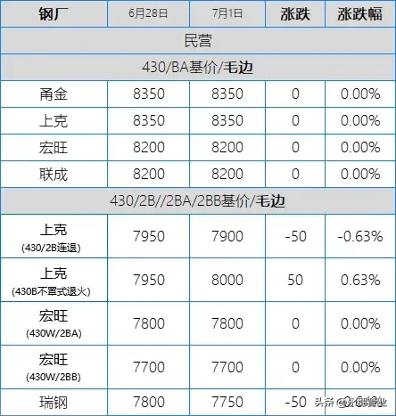 目前市場主流報價:410S熱軋黑皮在6100-6150元/噸;430熱軋黑皮在6700-6800元/噸;太鋼/酒鋼430/2B(毛)在7950-8000元/噸;聯(lián)眾430/2BA(毛)在7850元/噸左右;宏旺430/2BA(毛)在7750-7800元/噸;甬金430/BA(毛)在8350元/噸左右;上克430/BA(毛)在8350元/噸左右;宏旺430/BA(毛)在8150-8200元/噸;瑞鋼430/2BA(毛)在7700-7750元/噸,其中期貨價在7800元/噸左右;聯(lián)成430/BA(毛)在8200元/噸左右。