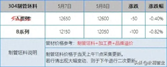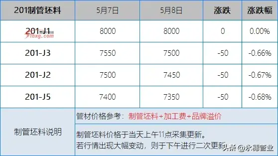 較昨日早間,今日早間市場201報(bào)價(jià)多數(shù)持平,個(gè)別下跌50元/噸;304報(bào)價(jià)下跌20-50元/噸,個(gè)別高位下跌100元/噸,目前主流報(bào)價(jià)區(qū)間:201新料在5850-5950元/噸;304新料在10400-10500元/噸。
