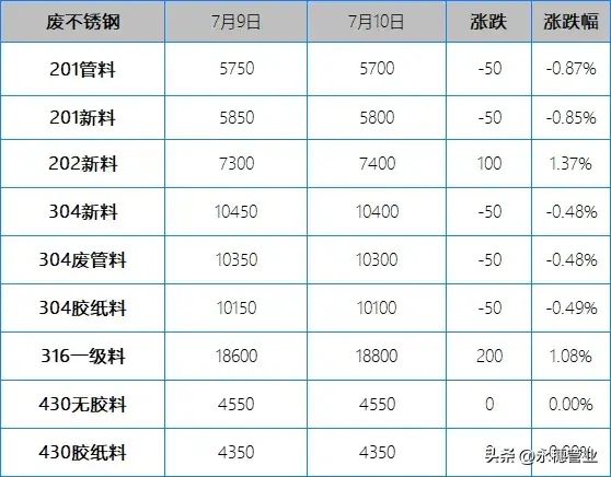 較昨日早間,今日早間市場(chǎng)201報(bào)價(jià)部分持平,部分下跌30-50元/噸;304報(bào)價(jià)部分持平,部分下跌50-100元/噸,目前主流報(bào)價(jià)區(qū)間:201新料5700-5800元/噸;304新料在10300-10400元/噸。
