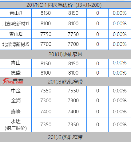 今日,青山代理報(bào),J1-8150元/噸,J3-7950元/噸,J4-8650元/噸,J2-7750元/噸,交貨期仍是3月10日前。市場(chǎng)貿(mào)易商整體報(bào)價(jià)波動(dòng)不大,但價(jià)格依然有高低不一呈現(xiàn)。可見(jiàn)報(bào)價(jià)有,鼎信J2不含稅報(bào)價(jià)7120-7150元/噸;北部灣新材報(bào)J5料7700元/噸,J1四尺8100元/噸,J1五尺8200-8250元/噸(期貨8150);寶鋼BN1TL窄帶7600元/噸,大板7700元/噸;中金J3含稅7530-7550元/噸;中金J5料、金海J3料、鑫峰J3料、永達(dá)J3料7380-7500元/噸。