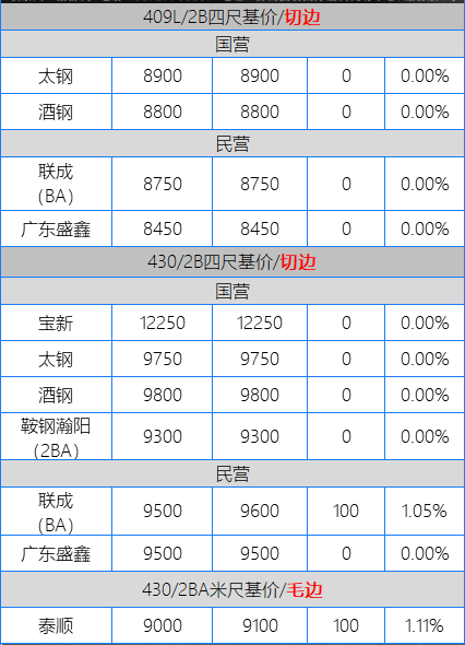 早間,市場(chǎng)報(bào)價(jià)部分持平,部分繼續(xù)有漲100元/噸,目前主流報(bào)價(jià):太鋼9700-9800元/噸、酒鋼在9750-9850元/噸、聯(lián)眾430/2BA在9200-9500元/噸。
